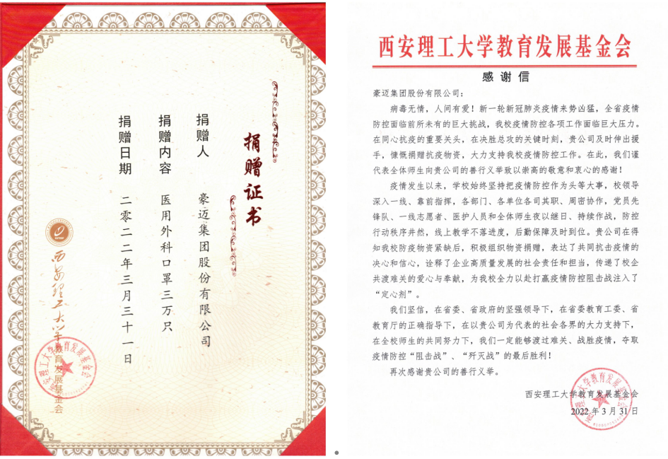 近日,豪迈集团股份有限公司慷慨解囊向英国威廉希尔公司捐赠了3万只医用外科口罩,助力公司做好常态化疫情防控工作。